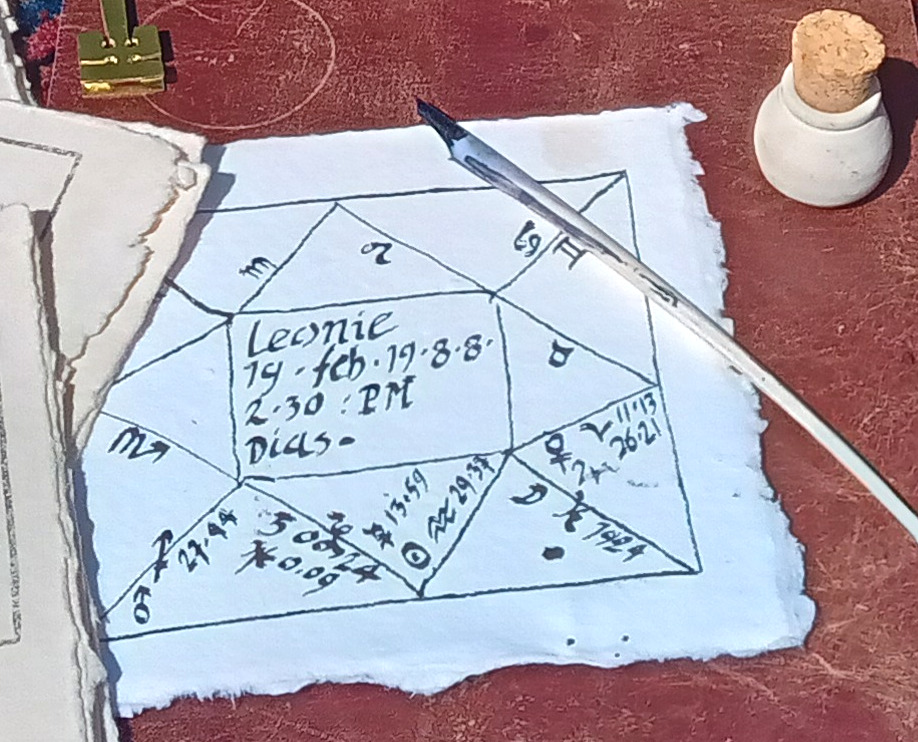 Je hemelfiguur, ofwel horoscoop, in Middeleeuwse of 17e Eeuwse stijl. Gemaakt op handgeschept of hennep-papier. Handgetekend met de pennenveer; uniek op basis van jouw geboorte. In sfeer en stijl zoals ze vroeger gemaakt werden.